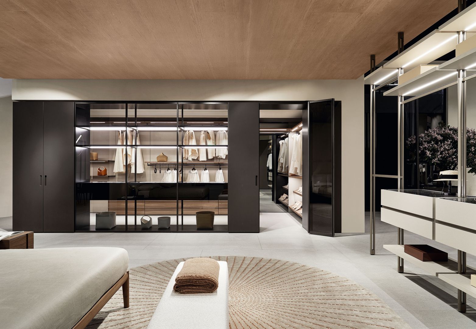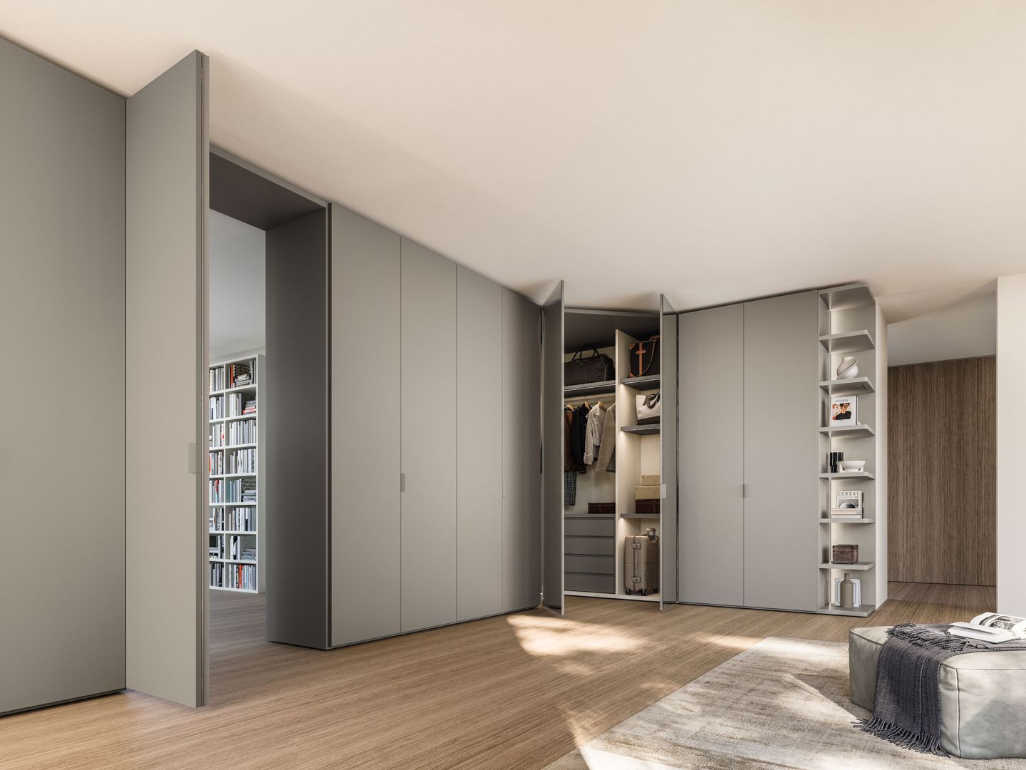 Elegante Durchgangslösungen, perfekt eingebundene Ecklösungen sowie raumhohe Schränke und maßgefertigte Einbauten sorgen für ein harmonisches, durchgängiges Design.