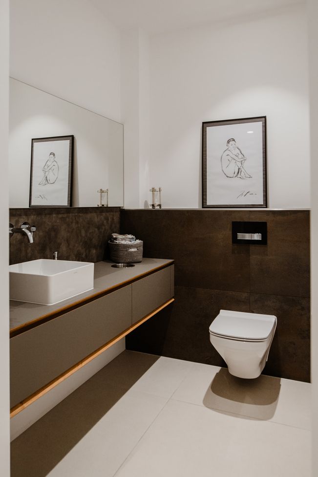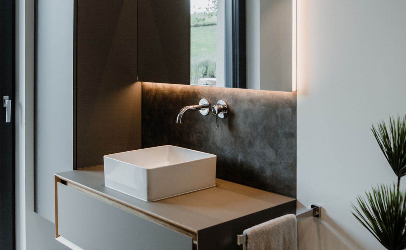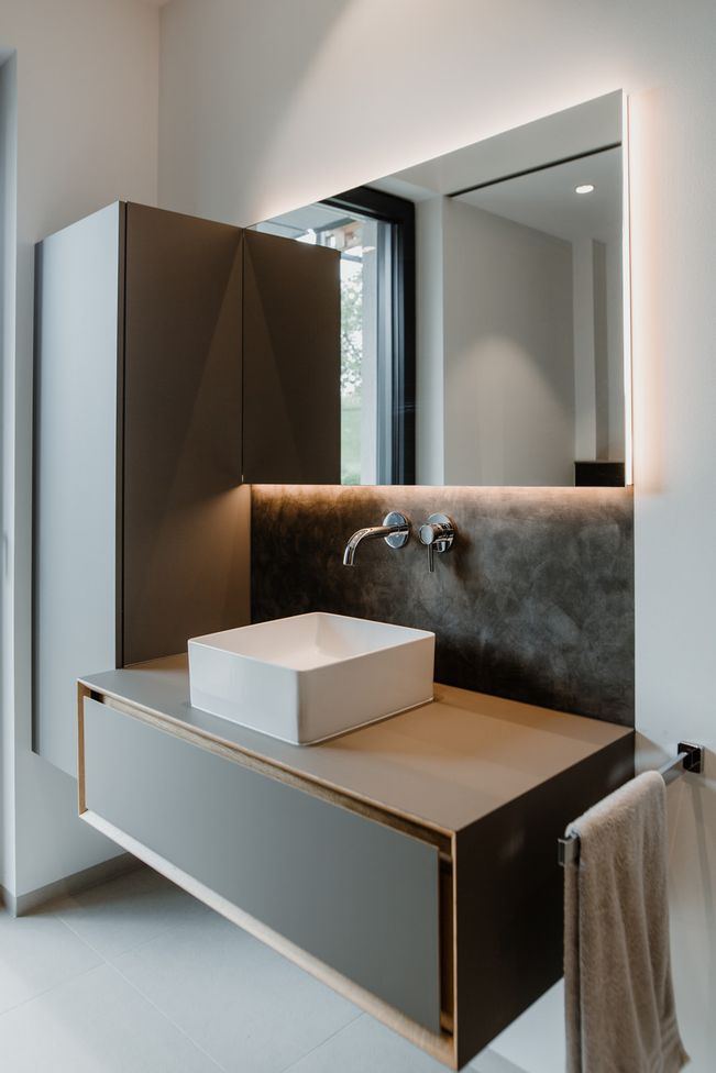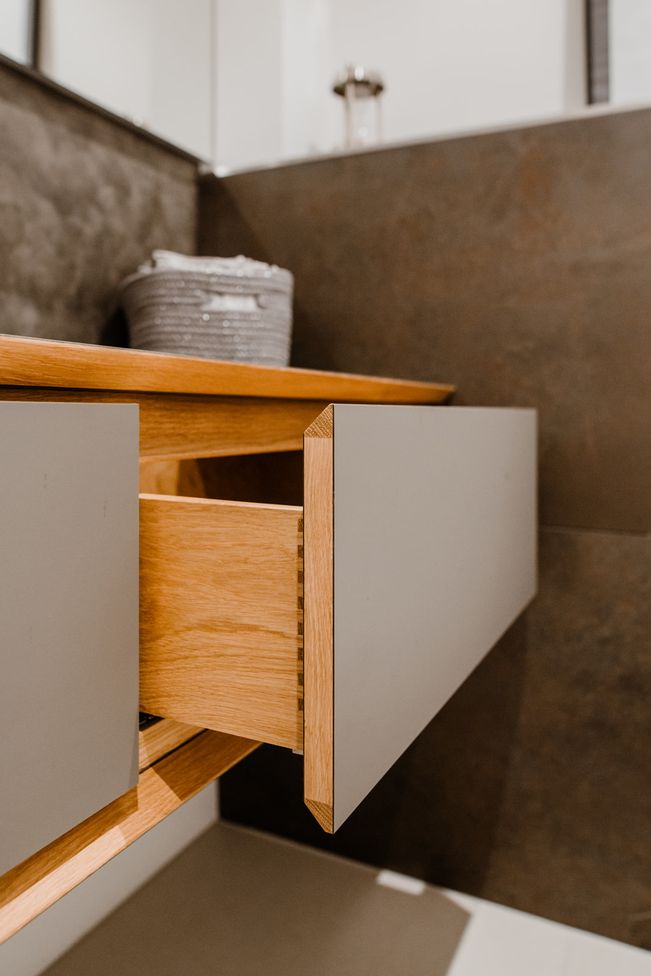 Die Badezimmer- und WC-Einrichtung fällt durch die besondere Form der Laden auf. Die Abschrägung an Korpus und Laden erzeugen einen optischen Rahmen und lässt das Eichenholz von der grauen Oberfläche hervorblitzen.