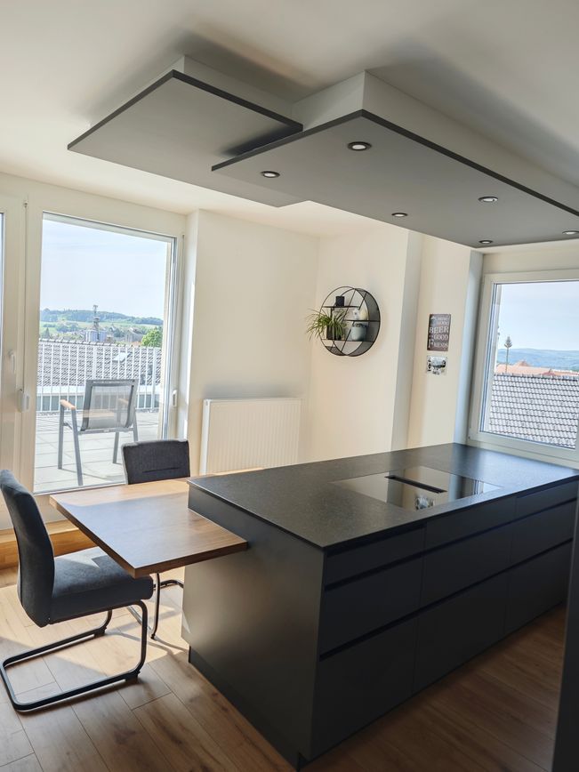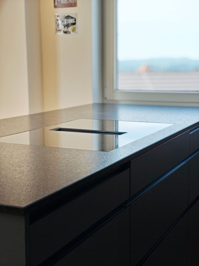 Besonders beeindruckend ist die robuste Steinarbeitsplatte „Black Tea“ mit feiner Struktur. Die Insel mit grifflosen Fronten unterstreicht das klare, reduzierte Design. Dezente Beleuchtung unter den Oberschränken und ein Deckenfeld mit integrierten Spots sorgen für die perfekte Atmosphäre.