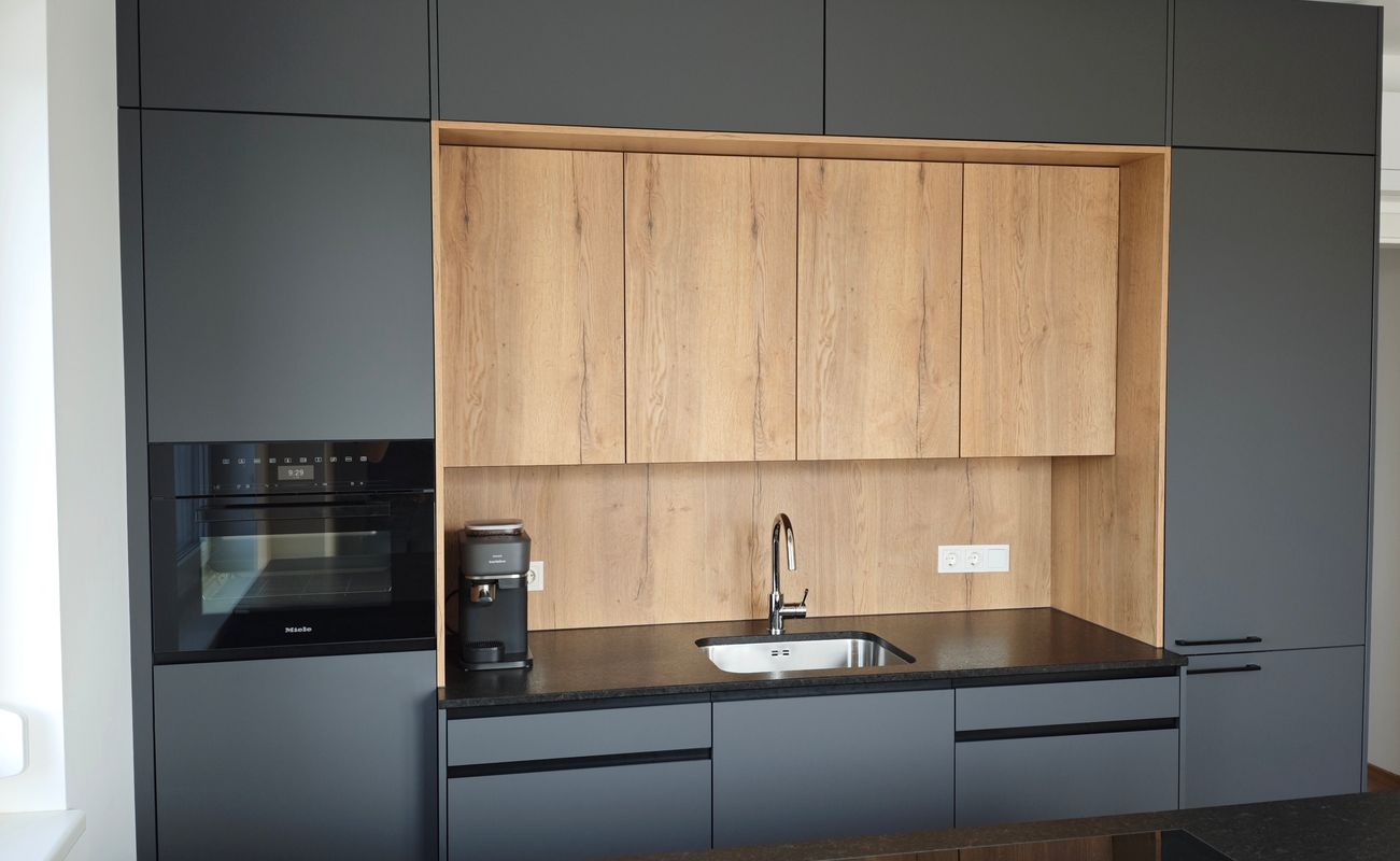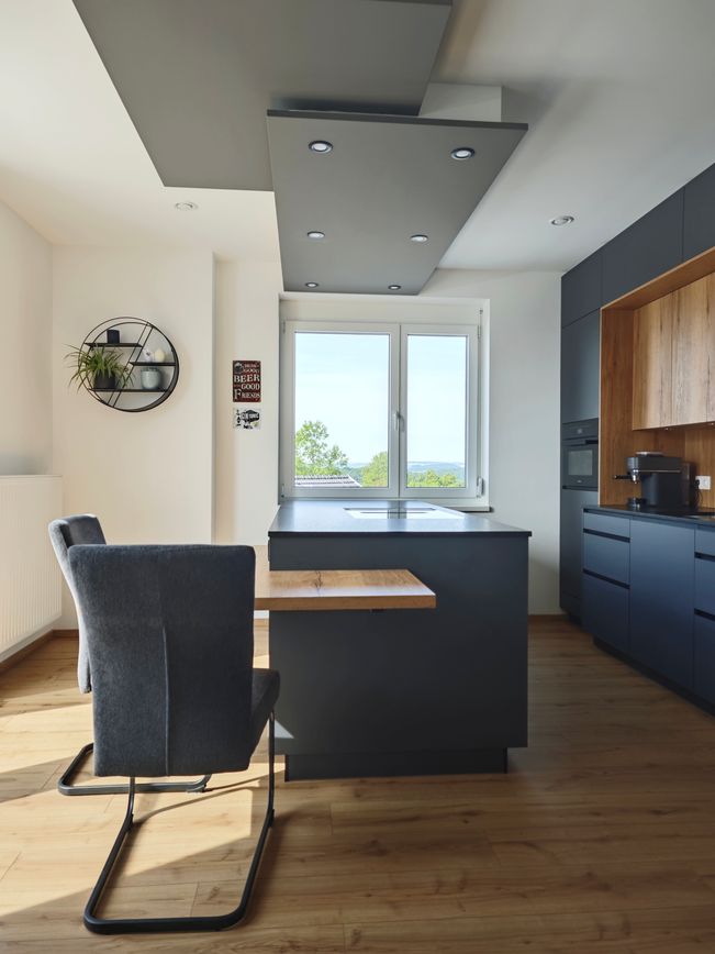 Diese moderne Küche besticht durch eine elegante Kombination aus mattem Graphit-Direktlack und einem farblich abgestimmten Korpus. Die Nische in naturbelassener Alteiche setzt einen warmen, wohnlichen Akzent und schafft harmonische Balance.