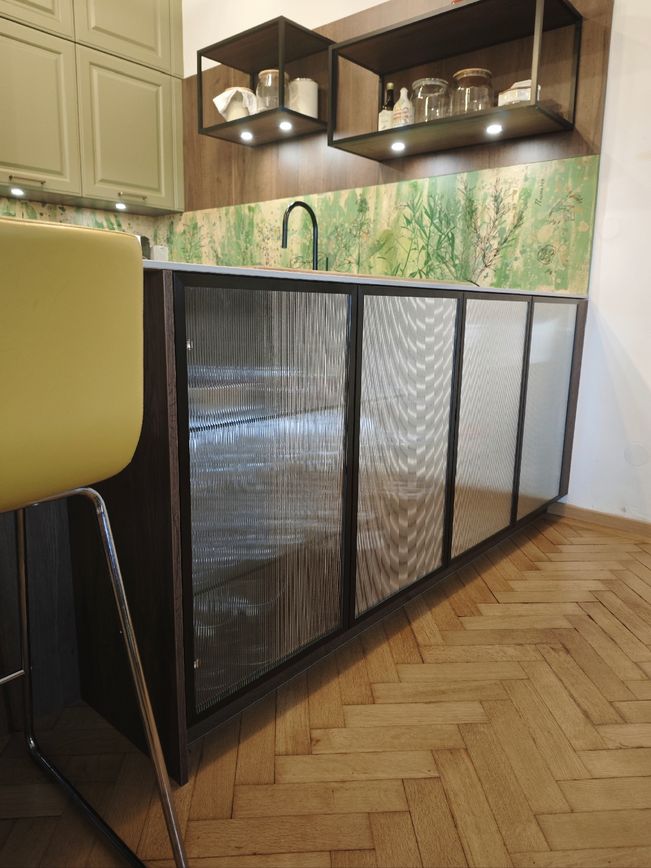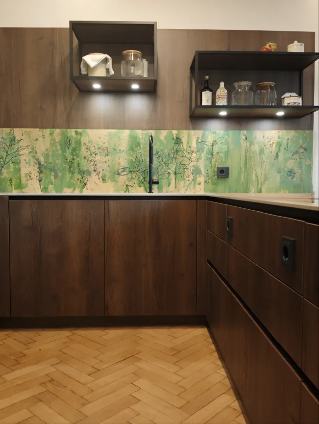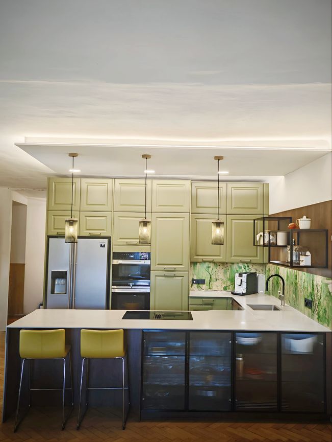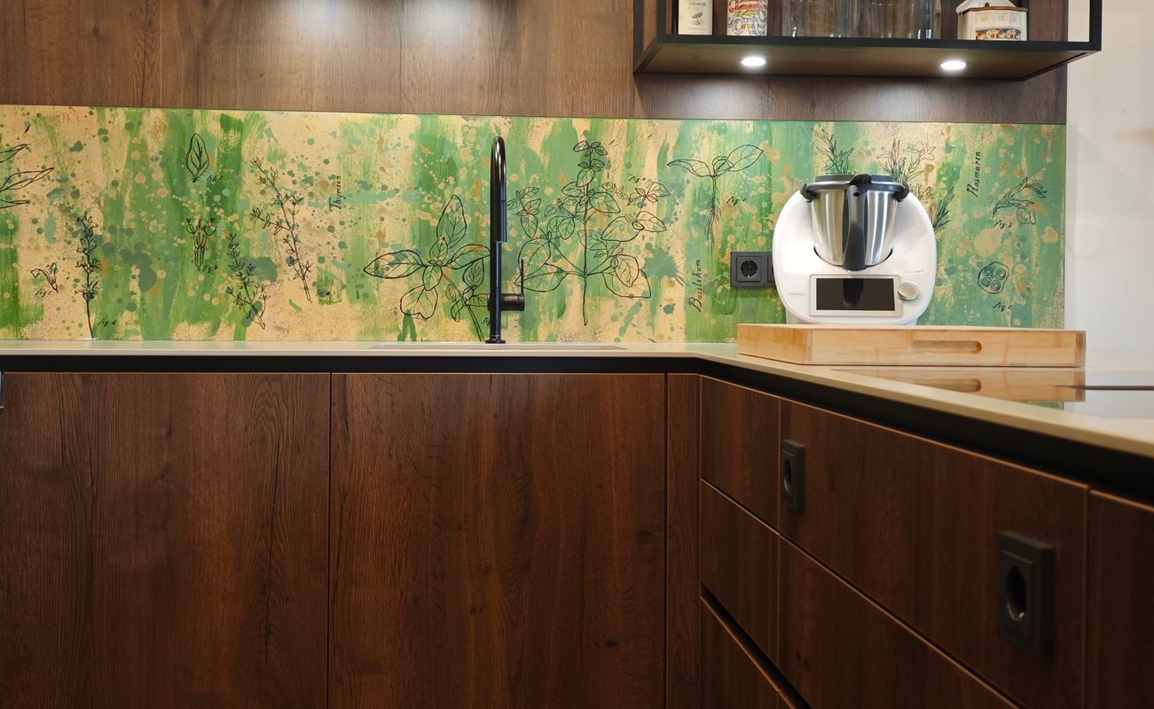 Zwei Stilrichtungen verschmelzen in dieser Planung zu einem stimmigen Gesamtbild. Die schilfgrünen Lackfronten im klassischen Landhausstil schaffen eine warme, wohnliche Atmosphäre, während moderne Akzente in Alteiche Cognac für Natürlichkeit und Tiefe sorgen. Trotz großzügigem Stauraum wirkt die Küche klar und ausgewogen – nichts wirkt überladen.