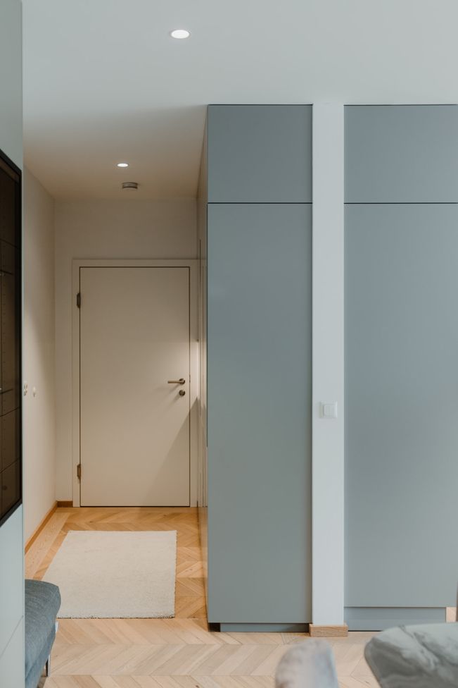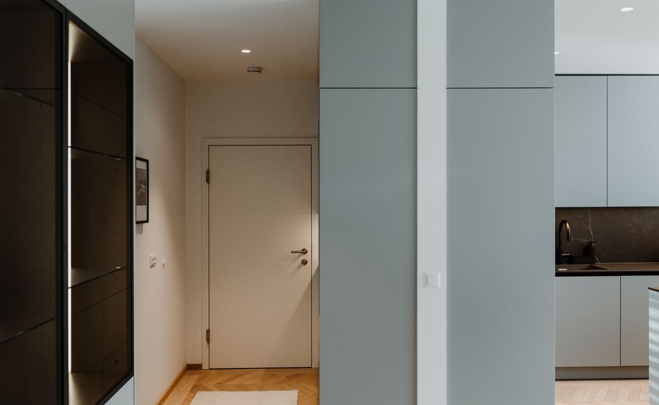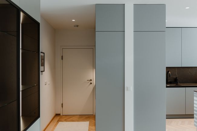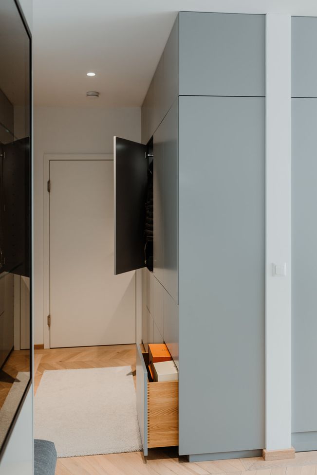 Direkt an der Rückseite der Küche wurde der Raum um eine Vorzimmerlösung ergänzt. Das Hauptaugenmerk wurde auf Stauraum und Praktikabilität gelegt. Gewählt wurde eine grifflose Ausführung mit Lackfronten passend zur Küche. Die beleuchtete Nische bietet Platz zur Ablage.