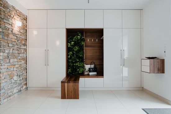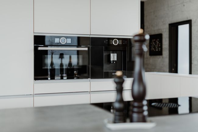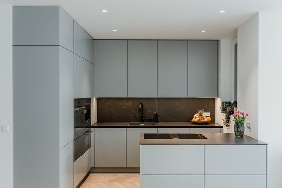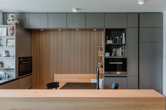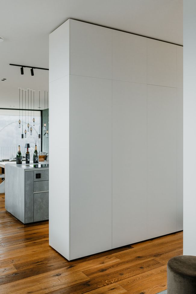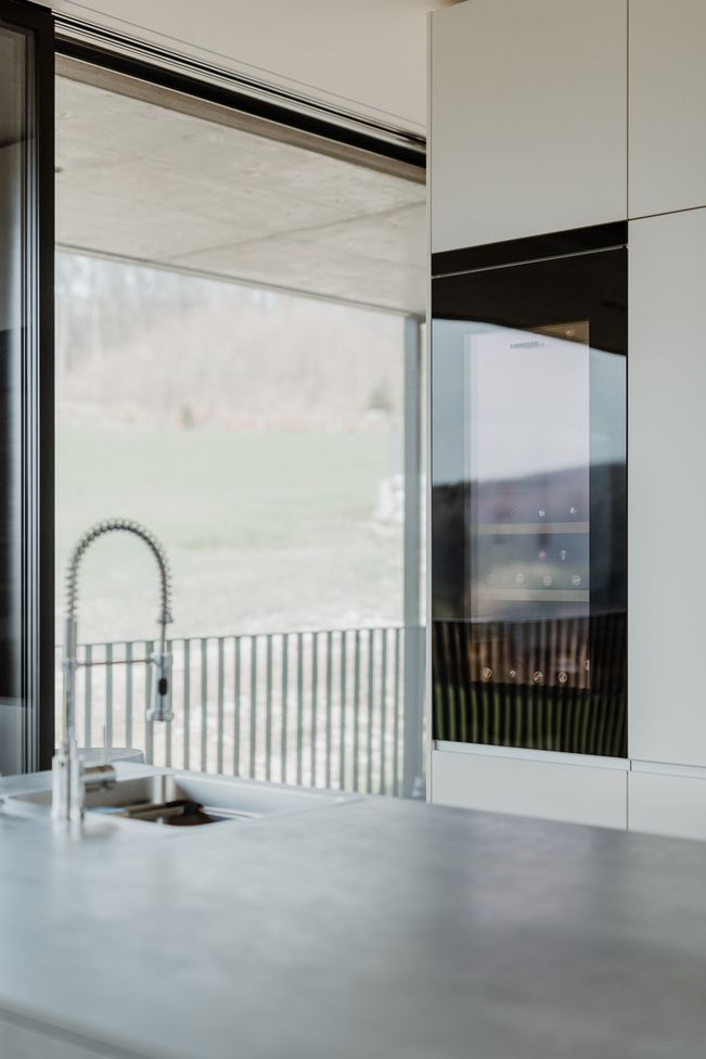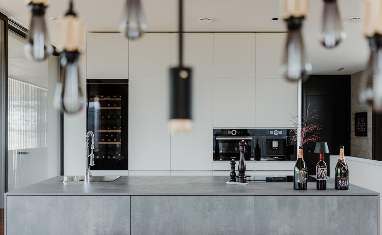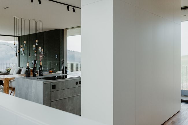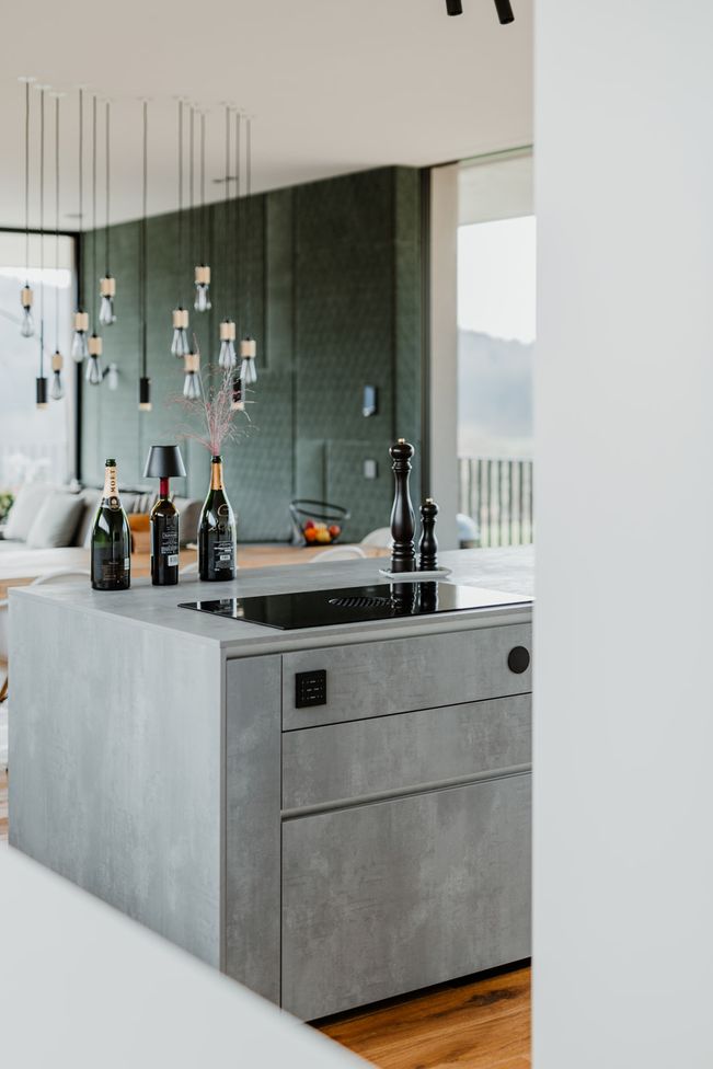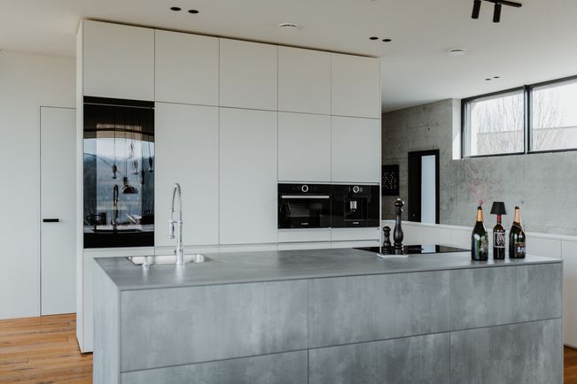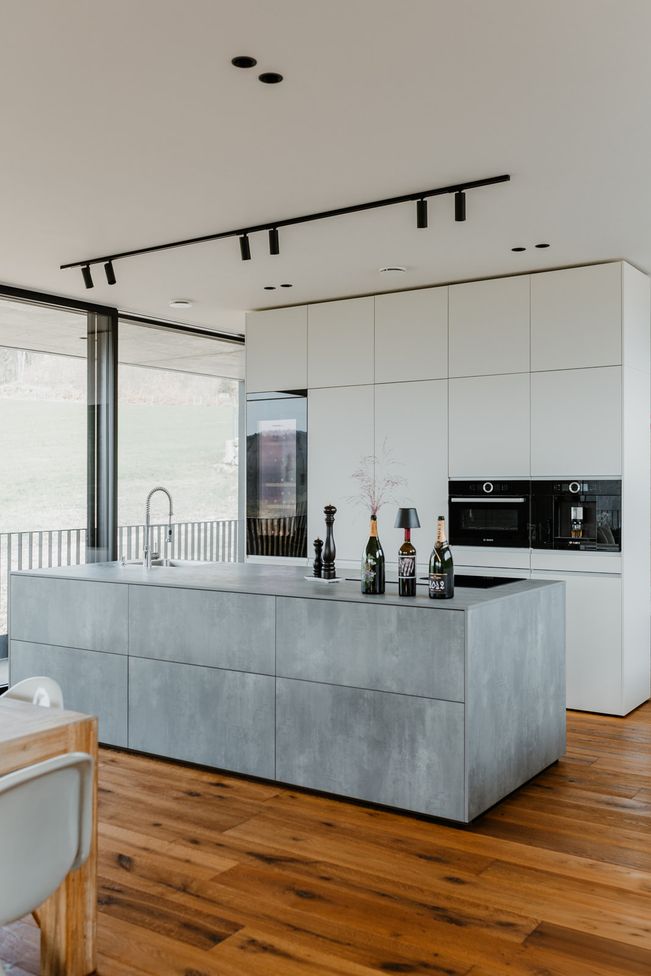 Der industrielle, aber wohnliche Look des Hauses bietet Platz für eine zentrale Kücheninsel in Spachtelbeton. Die bodennahen Fronten, die grifflose Ausführung und der Komplettlook mit extra dünner Arbeitsplatte in Betonoptik, ergänzt durch eine freistehende Hochschrankzeile als Raumtrenner, sorgen für ein stilvolles, zeitloses und einladendes Küchenambiente.