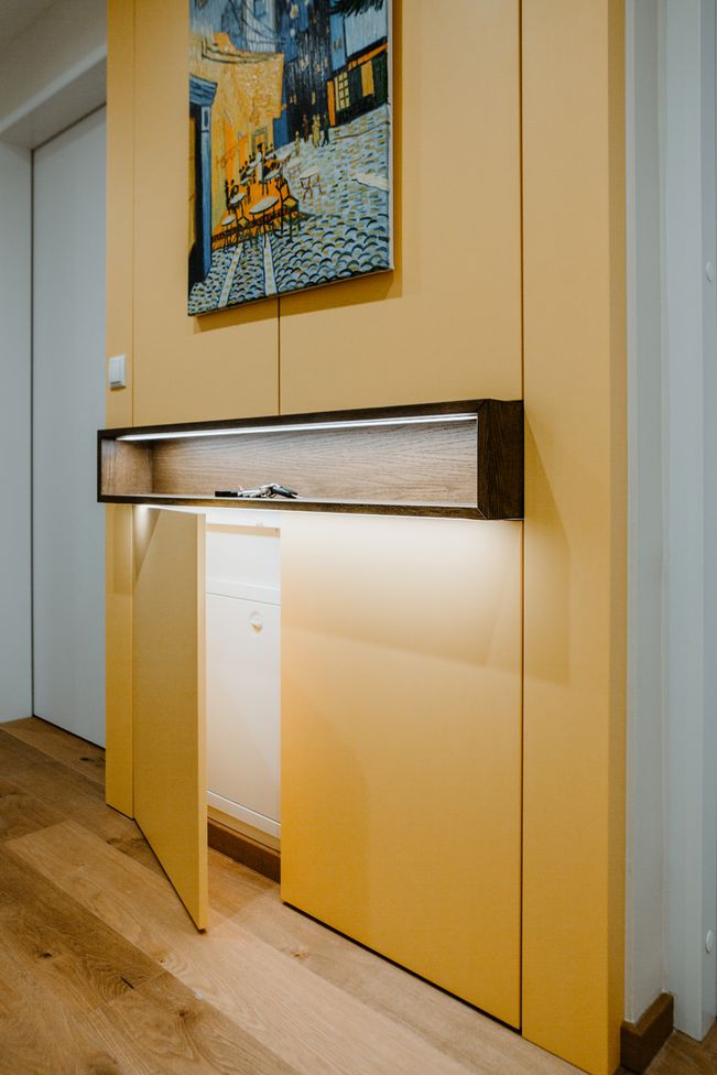 Das Korpuselement in Mattweiß mit zwei Kleiderstangen, das gelbe Wandpanel mit LED-beleuchteter Holznische, die grifflosen Tip-On-Türen, die Garderobenleisten sowie die vertikalen Holzlamellen aus gebeizter Eiche stammen aus unserer hauseigenen Tischlerei.