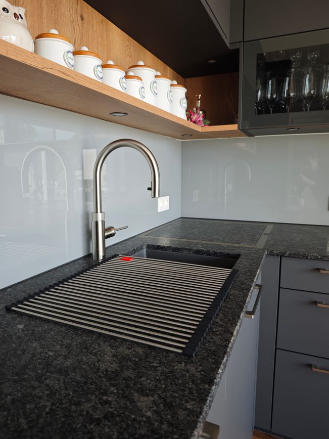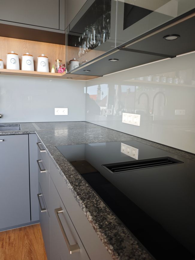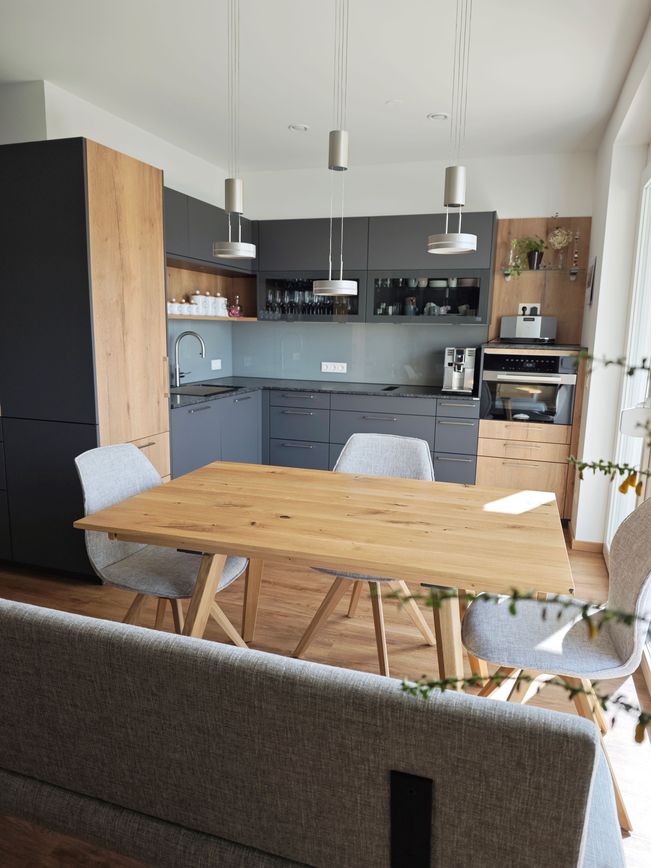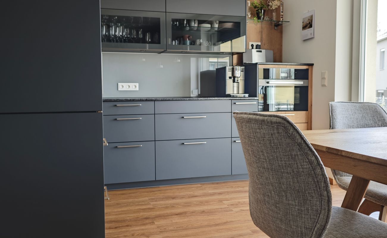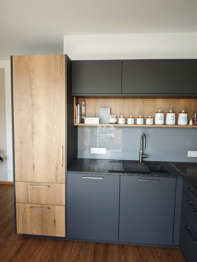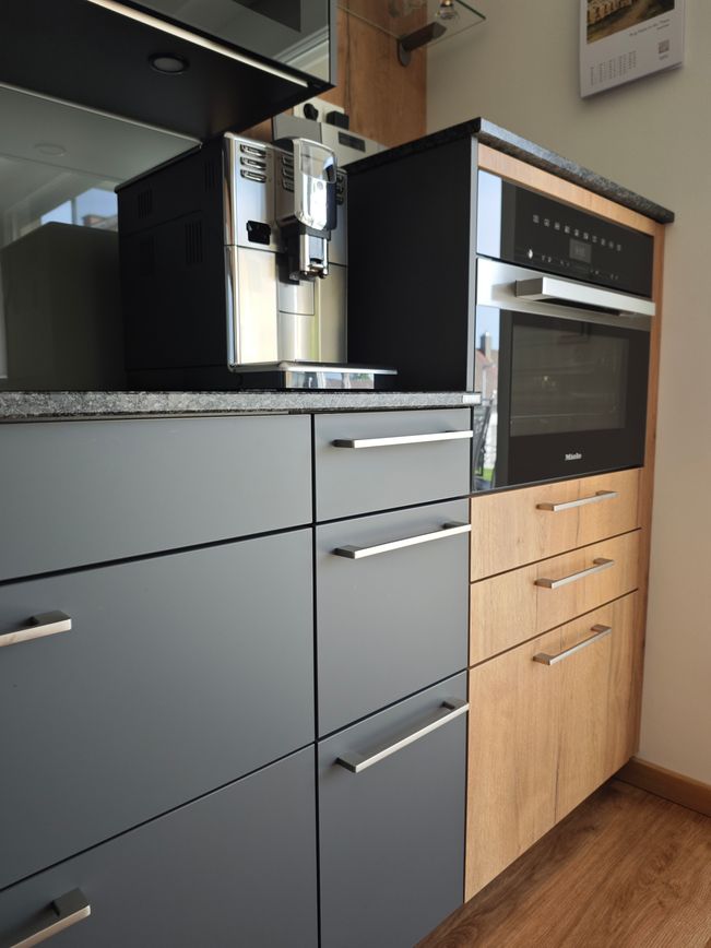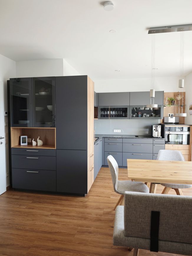 Diese elegante Küche in Graphit wird durch warme Eiche-Akzente ergänzt und schafft ein stilvolles, harmonisches Ambiente. Klare Linien und hochwertige Materialien, wie die edle „Silver Pearl“ Natursteinarbeitsplatte, unterstreichen die hochwertige Gestaltung.