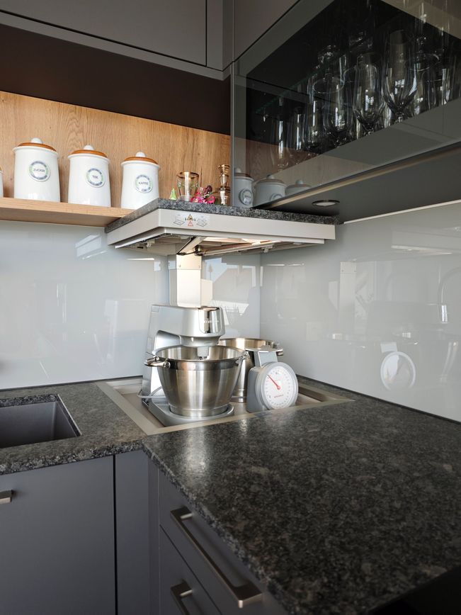 Praktisch und clever: Die Funktionsecke mit integriertem Gerätelift verstaut Küchenhelfer wie die Küchenmaschine dezent und ermöglicht bei Bedarf ein einfaches Herausnehmen.