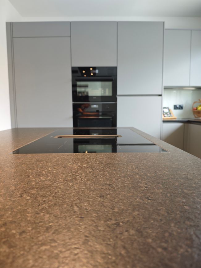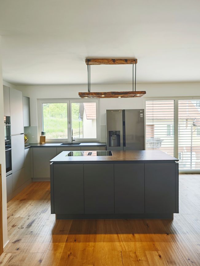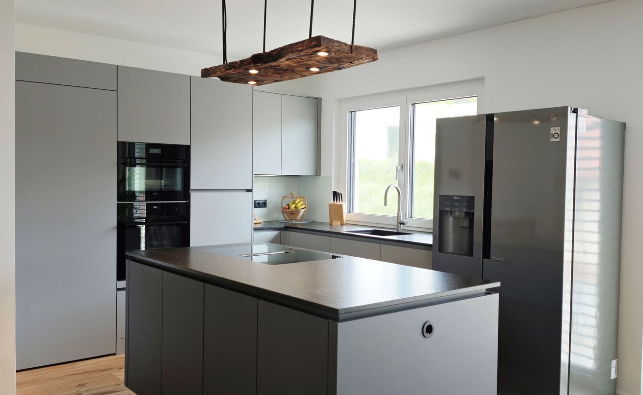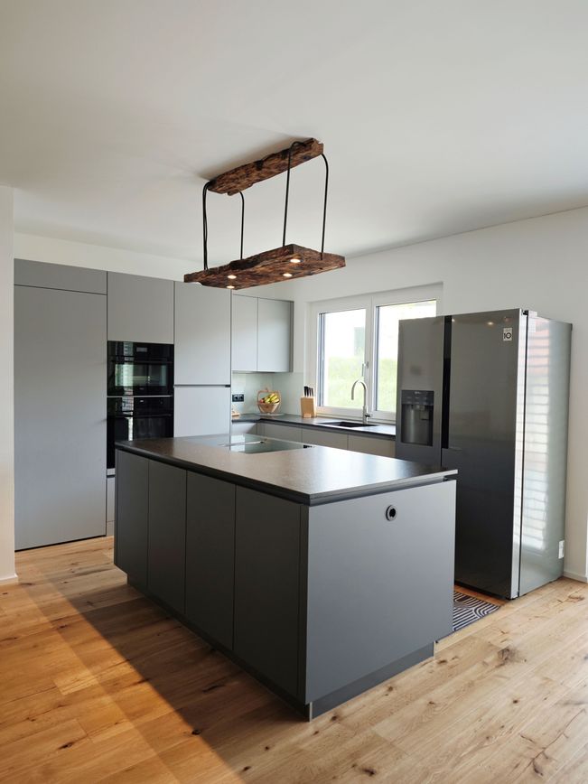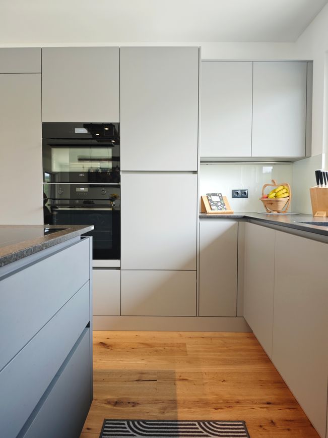 Diese Küche besticht durch ihr griffloses Design mit eleganten Frontfarben in Perlgrau und einer Insel in Graphit. Der integrierte Durchgangsschrank bietet cleveren Stauraum und zugleich praktischen Zugang zu einem zusätzlichen Abstell- oder Vorratsbereich.