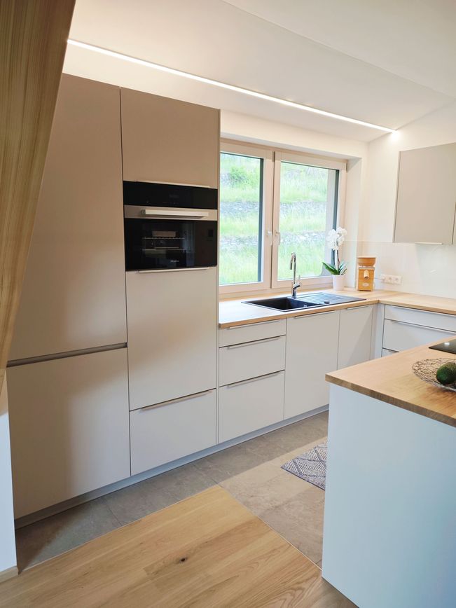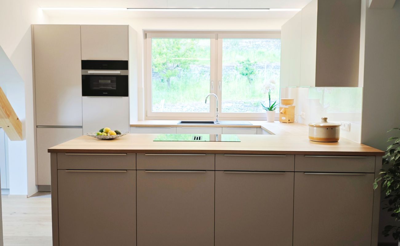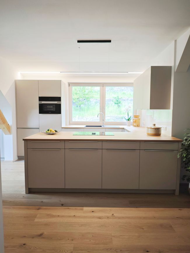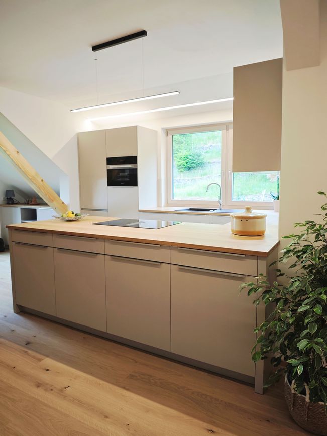 Moderne Zurückhaltung trifft hier auf natürliche Materialien und schafft eine warme, einladende Atmosphäre. Harmonisch eingebettet in eine Dachgeschosswohnung mit besonderem Charme. Die samtmatten Fronten in Kaschmir verleihen der Küche Ruhe und Eleganz, unterstützt von feinstrukturierter Oberfläche und klaren Linien.
