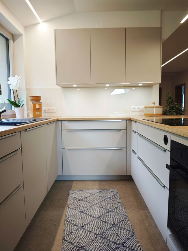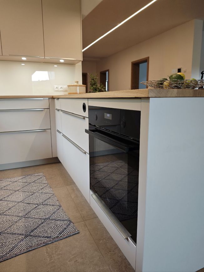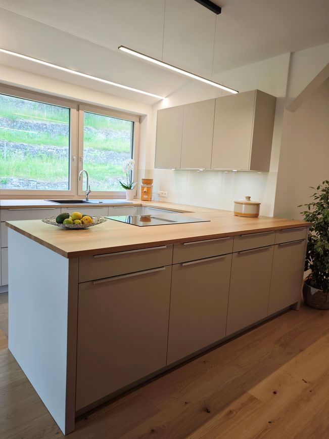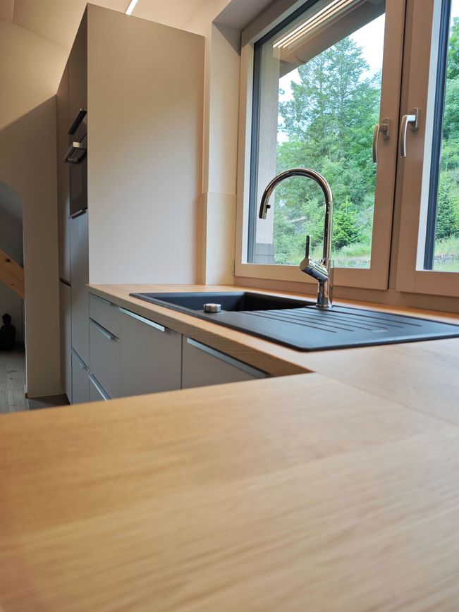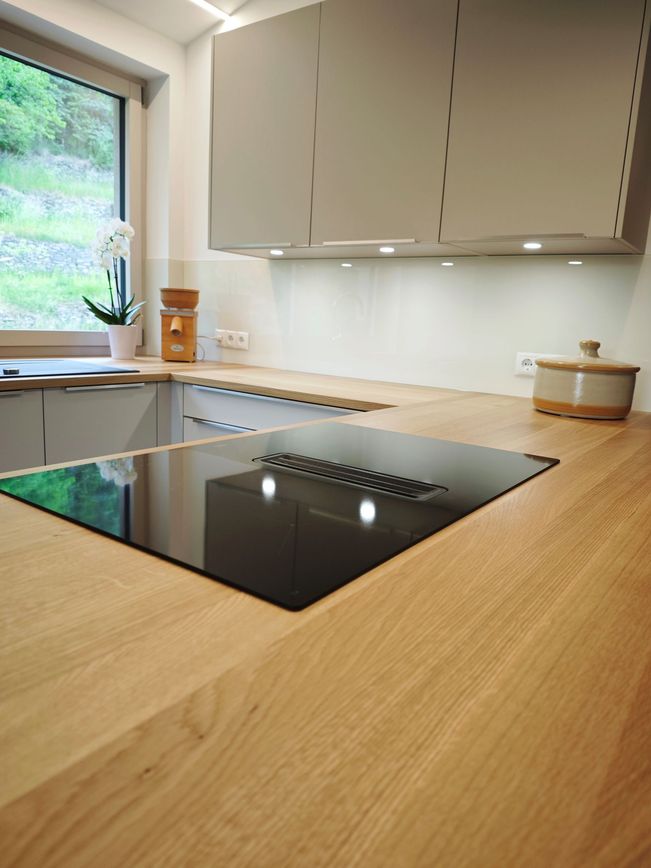 Ein Highlight ist die massive Eichenarbeitsplatte mit durchgehenden Lamellen. Sie bringt Wärme, Charakter und ein Stück Natur direkt ins Zuhause.